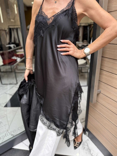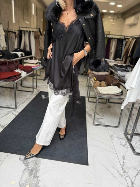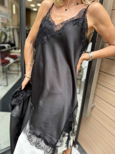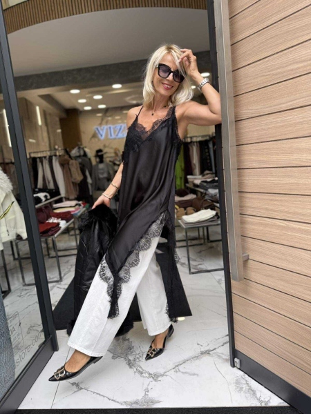 Топ от сатенирана материя с тънки презрамки и декорация от дантела. Моделът е със свободна кройка и е подходящ за размер M, L.