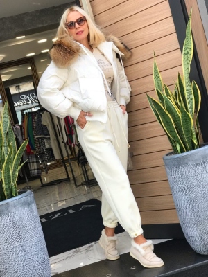 Яке в цвят бордо от шушлякова материя с яка от еко косъм. Моделът е леко трапецовиден, има качулка и се закопчава сако с копчета. Ръкавите до половината са от плетиво. Яката е с възможност за сваляне.