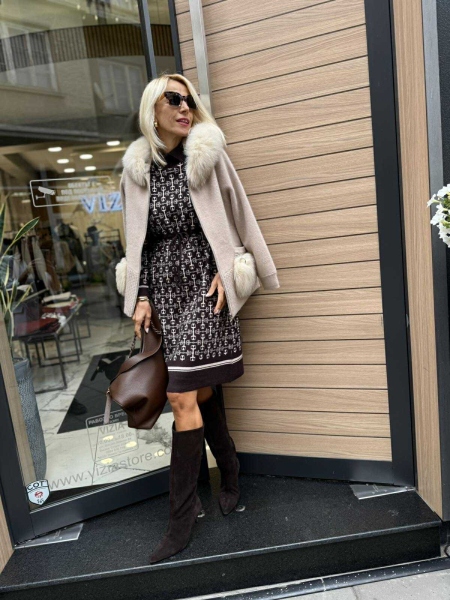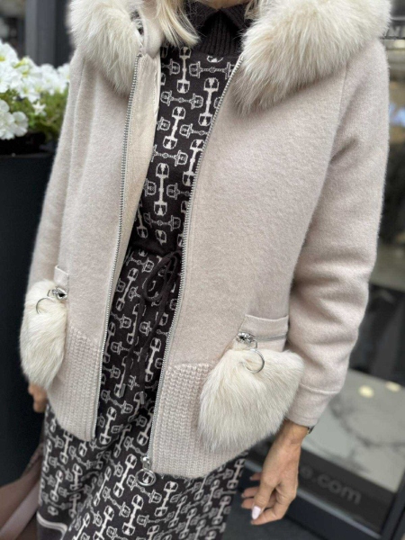 Жилетка тип якенце от кашмирена материя с декорация от естествен косъм по качулката и джобовете. Моделът се закопчава с цип и има подплата. Универсален размер подходящ за S, M.