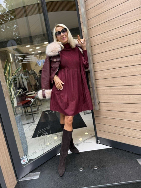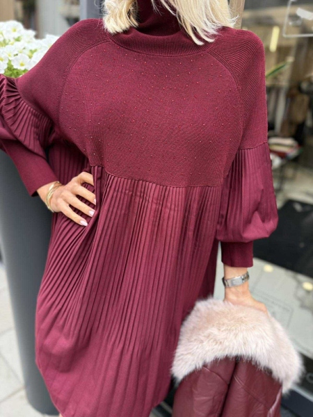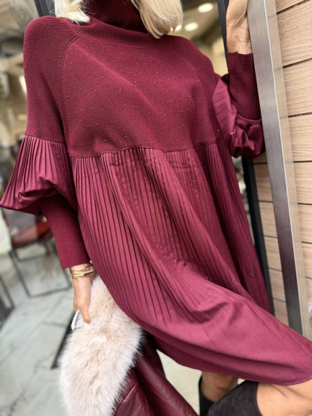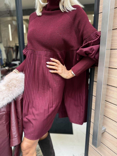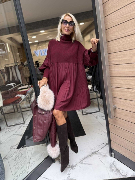 Рокля със свободна кройка в цвят бордо. Горната част е плетиво с поло яка, долата е солей от плат. Универсален размер подходящ за M, L, XL.