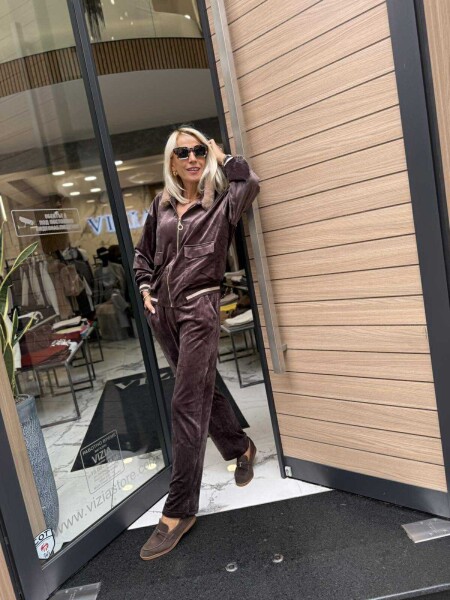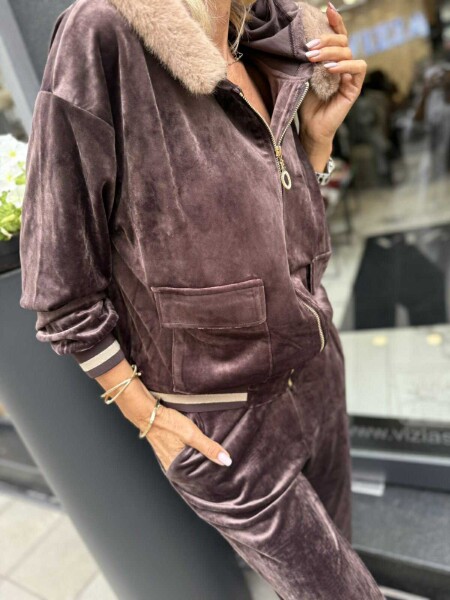 Комплект суитчер и панталон от плюшена материя в кафяв цвят. Суитчерът е свободен с метален цип, качулка с еко пух и ластик в долната част. Панталонът е с прав крачол, ластик на талията и закопчаюване с цип и копче.