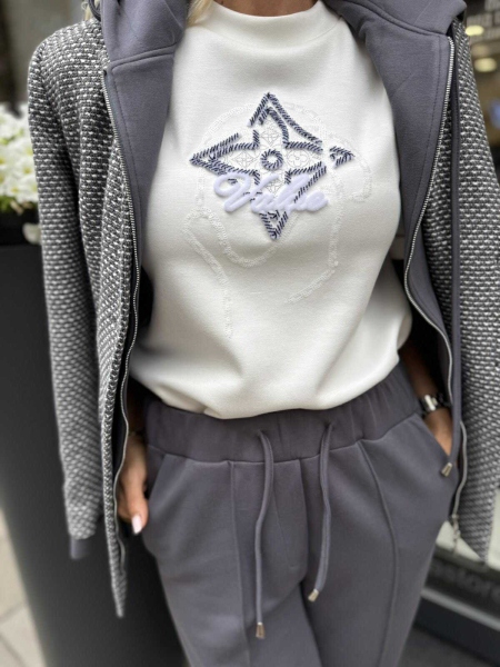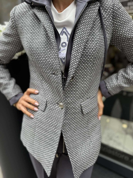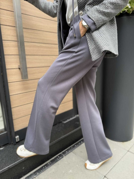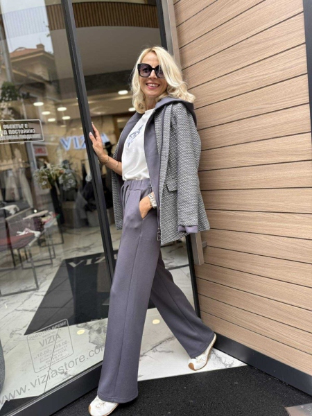 Комплект яке и панталон в сиво. Якето е от плътна и топла материя с метален цип и ластици на талията за вталяване. Панталон от трико с ластик на талията и широки крачоли.