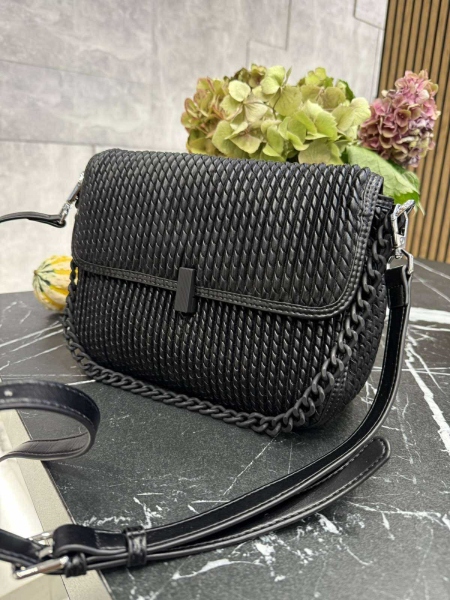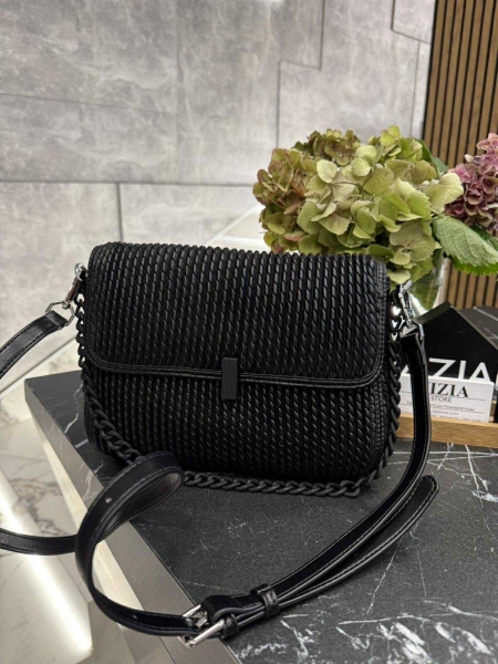 Малка чанта от еко кожа в черен цвят с дълга дръжка, която се регулира и къса тип синджирче.