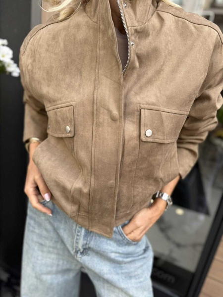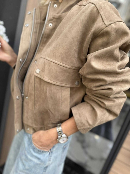 Яке тип бомбър от еко велур в бежов цвят с метален цип и ластик в долната част. Универсален размер подходящ за L/XL.