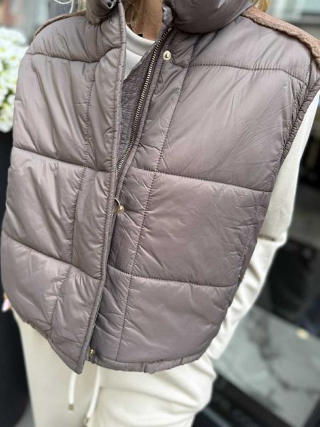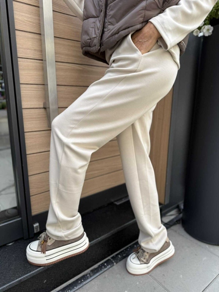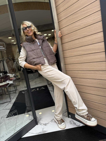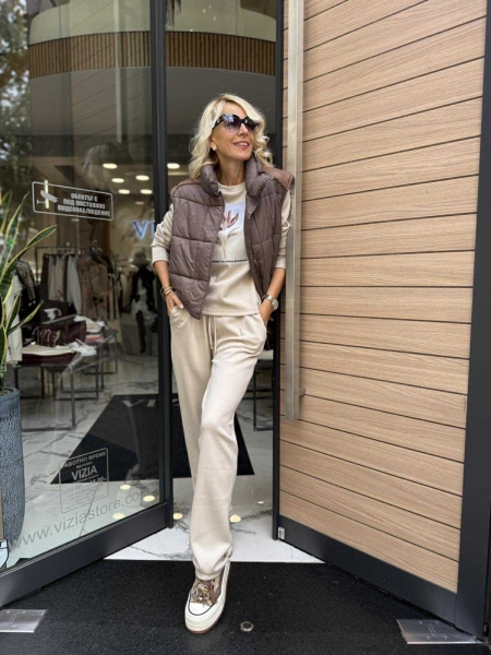 Комплект от три части в бежов цвят. Елекът е от шушлякова материя с еко кожа на раменете. Блузата е от трико с права кройка. Панталонът е от трико с прави крачоли и ластик на талията.