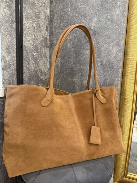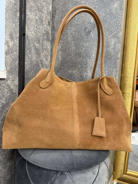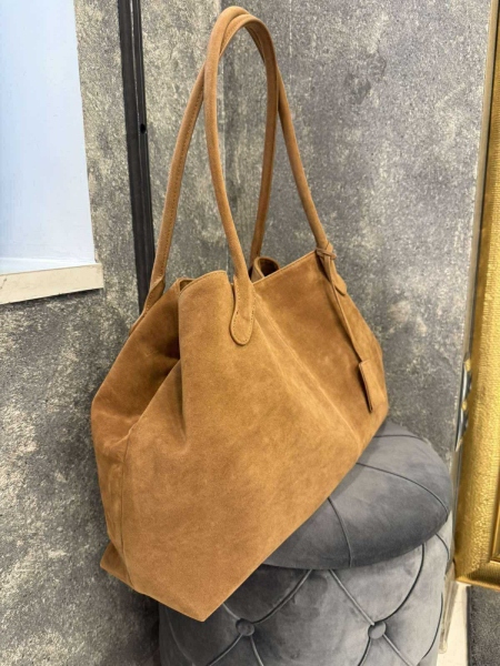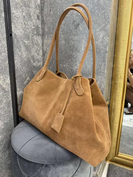 Чанта от естествен велур в светло кафяв цвят. Моделът е с едно отделение с копче и може да се свива отстрани за по- малък размер.