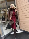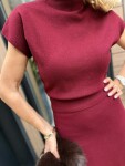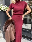 Комплект блуза с пола от фино плетиво в цвят бордо. Блузата е с поло яка, къс ръкав и ластик в долната част. Полата е миди дължина с ластик на талията. Универсален размер подходящ за S, M.