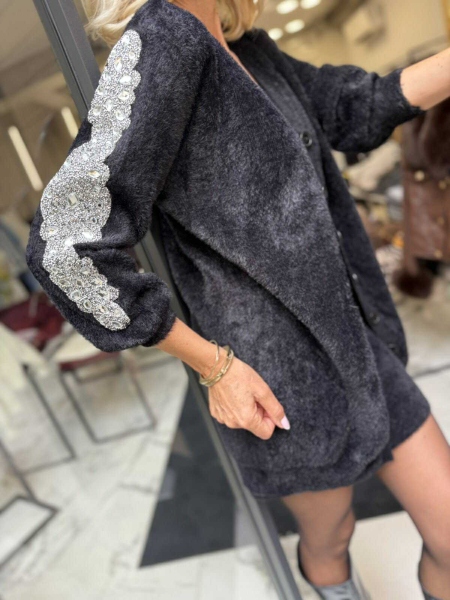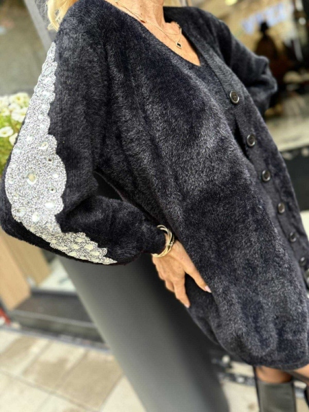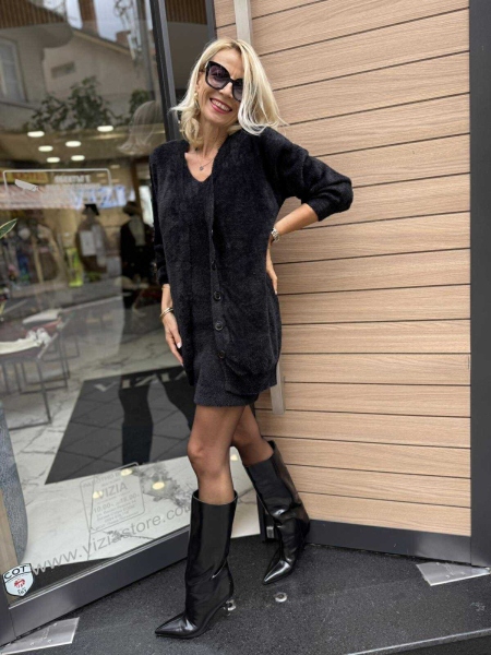 Комплект жилетка и рокля от фино плетиво в черен цвят. Жилетката е свободна, закопчава се с копчета и има декорация на единият ръкав. Роклята е с презрамки и втален силует. Универсален размер подходящ за S, M.