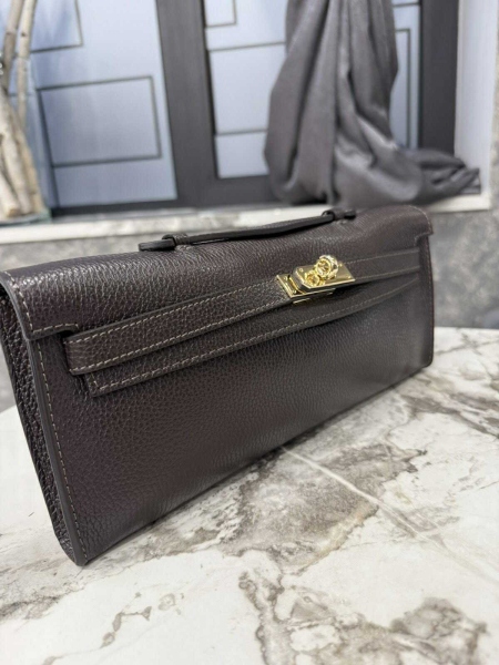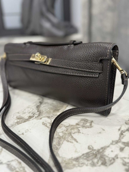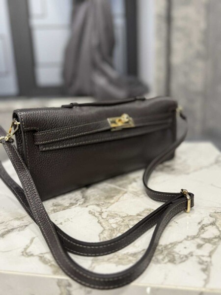 Чанта тип клъч от естествена кожа в тъмно кафяв цвят. Моделът е с къса дръжка и една дълга, която може да се сваля.