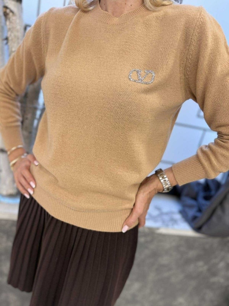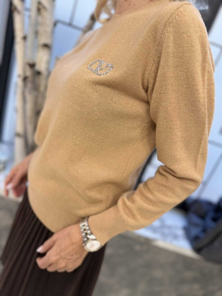 Пуловер от фино плетиво в цвят камел. Моделът е със свободен силует и има ластик в долната част. Универсален размер подходя за