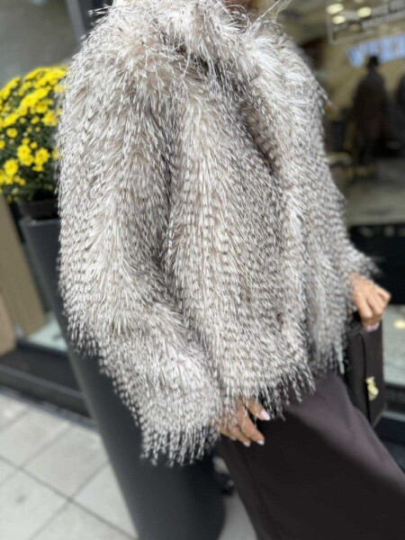 Палто от еко косъм в бяло и сиво. Моделът е със свободна кройка и се закопчава с копчета. Универсален размер подходящ за S, M.