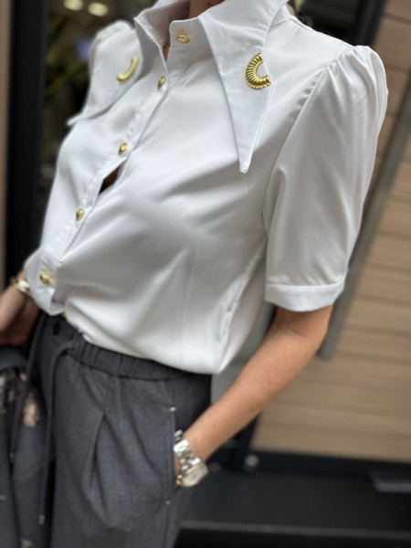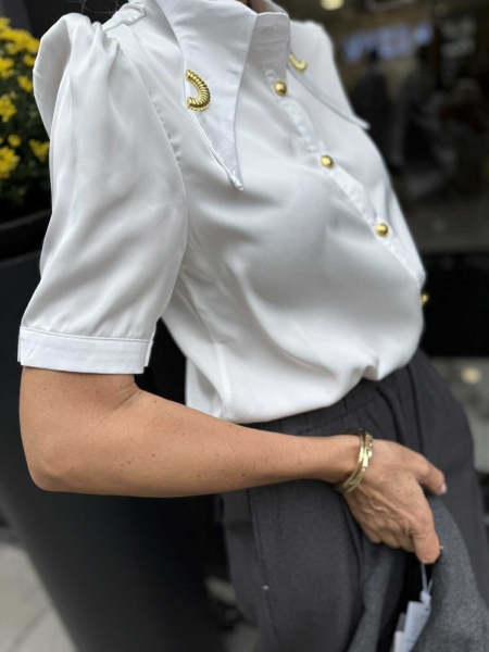 Риза от фина сатенирана материя с декорация от златисти елементи. Моделът е с остра яка и се закопчава с копчета.