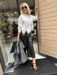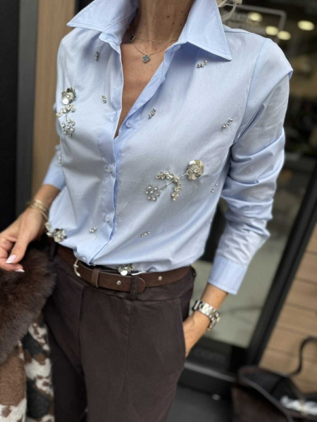 Риза в светло син цвят от памучна материя с декорация в предната част. Моделът е с леко вталена кройка и се закопчава с копчета. Универсален размер подходящ за S, M.
