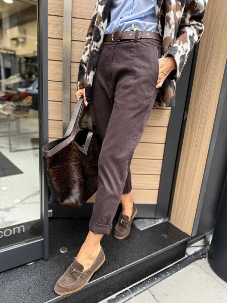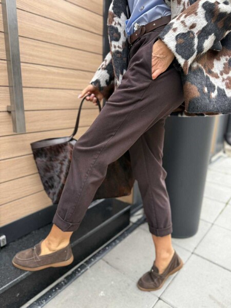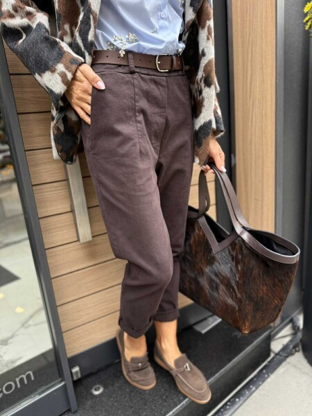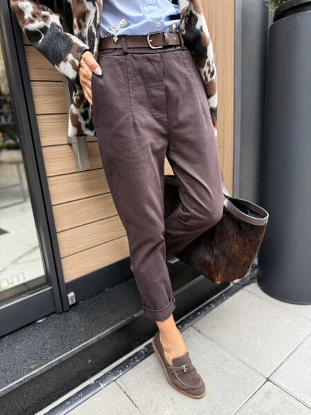 Панталон в кафяв цвят със стесняващи се крачоли, ластик на талията и странични джобове. Към него има и аксесоар колан.