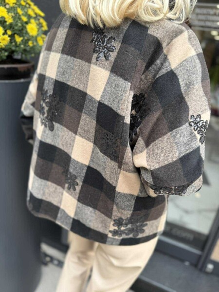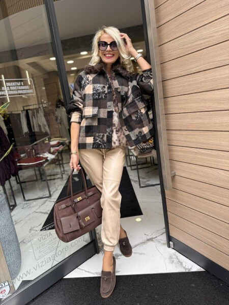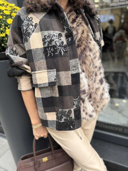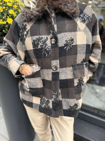 Късо палто със свободна кройка, външни джобове и яка от еко косъм без възможност за сваляне. Универсален размер подходящ за S, M, L.