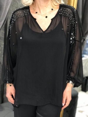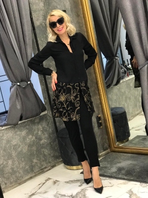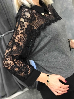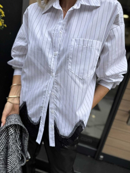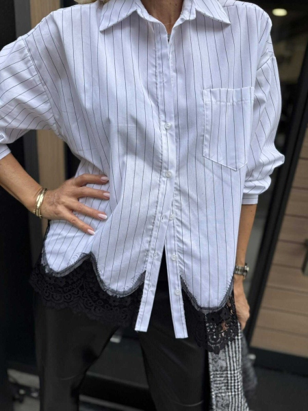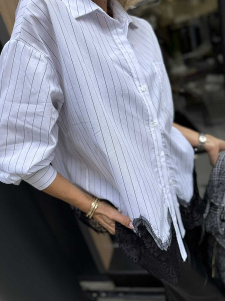 Риза със свободна кройка от памучна материя с декорация от черна дантела. Универсален размер подходящ за M, L, XL.