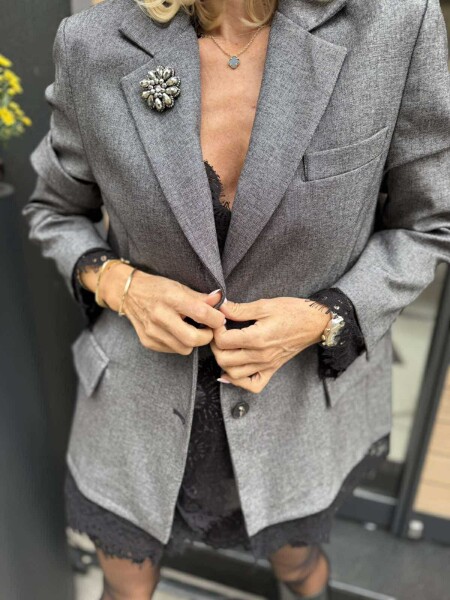 Комплект от три части в графитен цвят с декорация от дантела. Сакото е свободна кройка с ревери, копчета и външни джобове. Топ с тънки презрамки, остро деколте и страничен цип. Къса пола с леко разкроена кройка и закопчаване с цип.