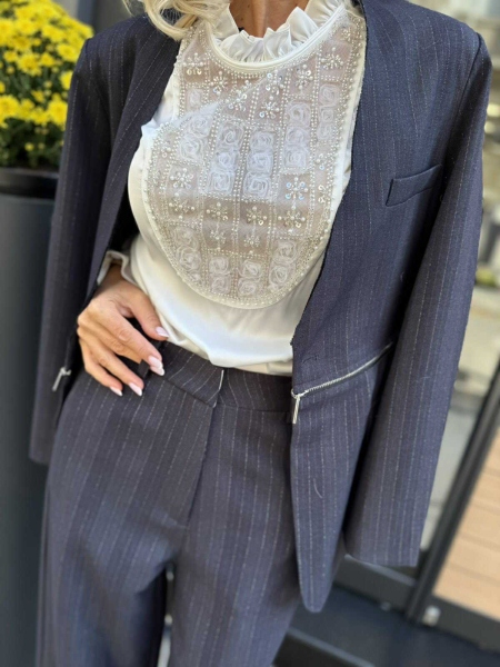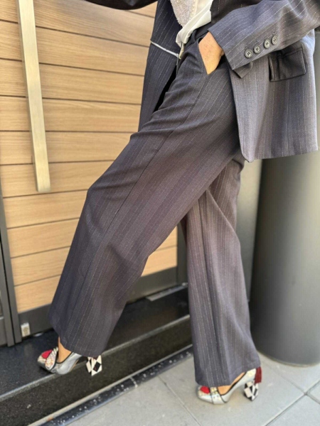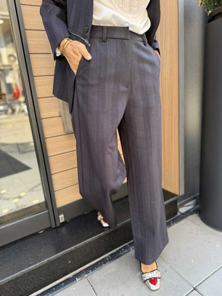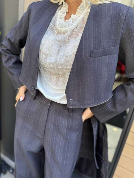 Комплект сако с панталон в тъмно син цвят с раиран десен. Сакото е свободно без ревери със свободен силует и има възможност да става късо. Панталонът е с широки крачоли, висока талия и закопчаване с цип и копче.