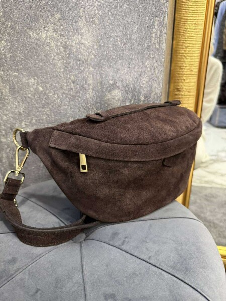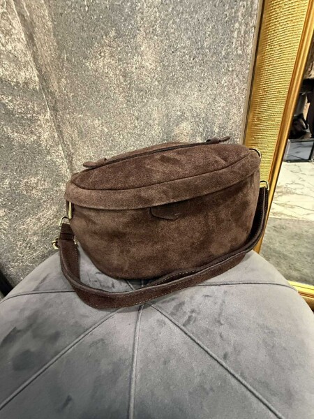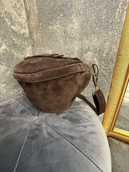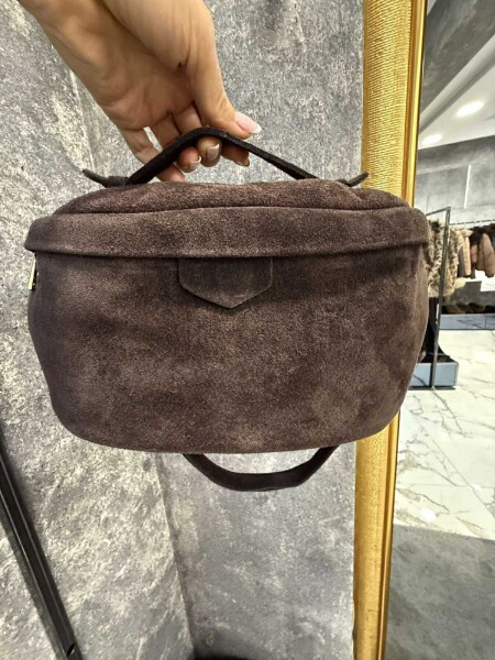 Малка чанта в кафяв цвят от естествен велур. Моделът е с една дръжка, която се регулира и се закопчава с метален цип.