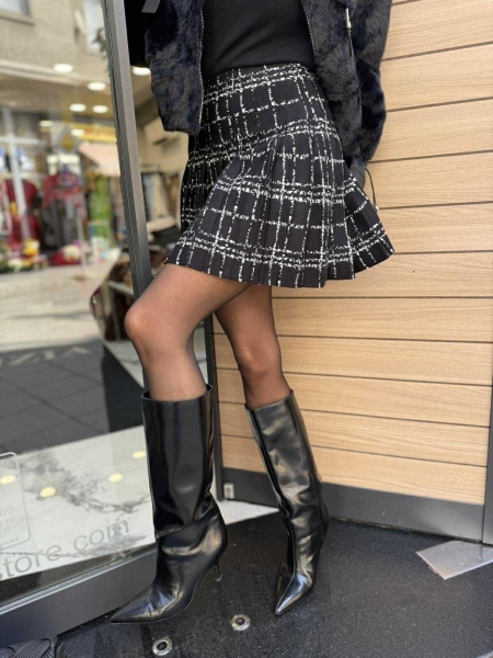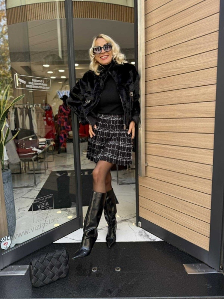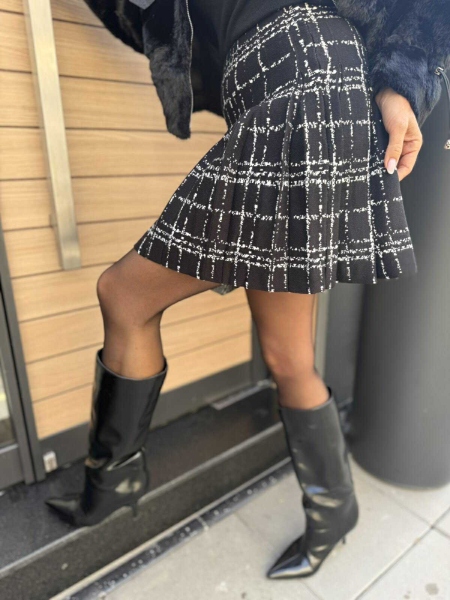 Къса пола от фино стегнато плетиво в черен цвят с бяло каре. Моделът е универсален размер подходящ за S, M.