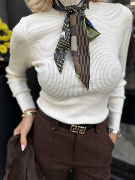 Полуполо от фино плетиво в цвят екрю. Моделът е със слим силует. Универсален размер подходящ за S, M.