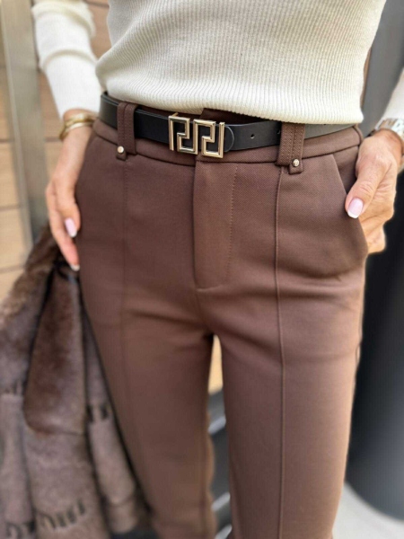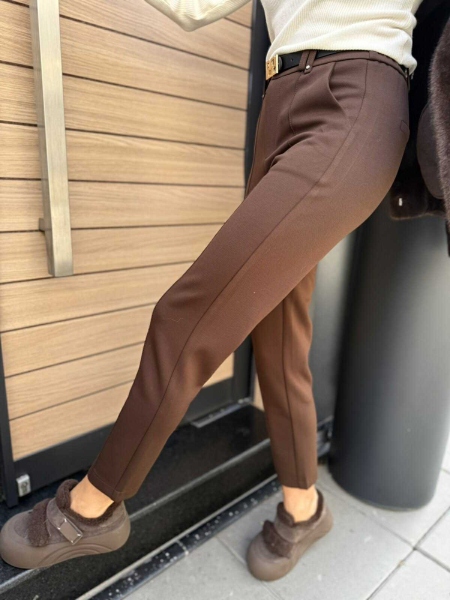 Панталон от плътна есенно- зимна материя наподобяваща трико в кафяв цвят. Моделът е с ластик на талията, закопчаване с цип и копче и крачолите елегантно се стесняват.