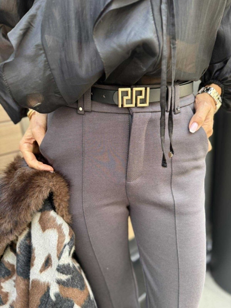 Панталон от плътна есенно- зимна материя наподобяваща трико в сив цвят. Моделът е с ластик на талията, закопчаване с цип и копче и крачолите елегантно се стесняват.