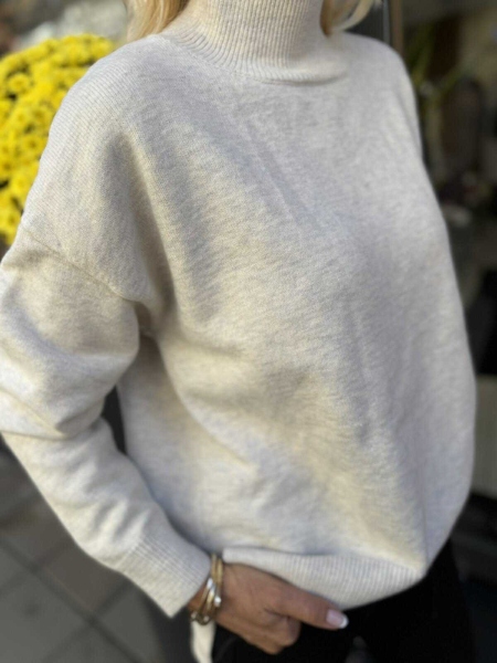 Плътен пуловер от фино плетиво в бежов цвят. Моделът е със свободна кройка. Универсален размер подходящ за M, L, XL.