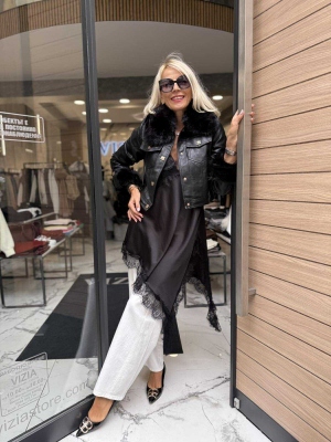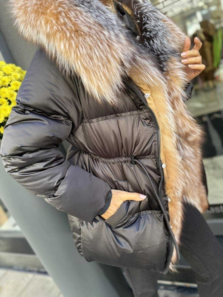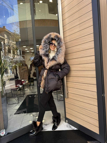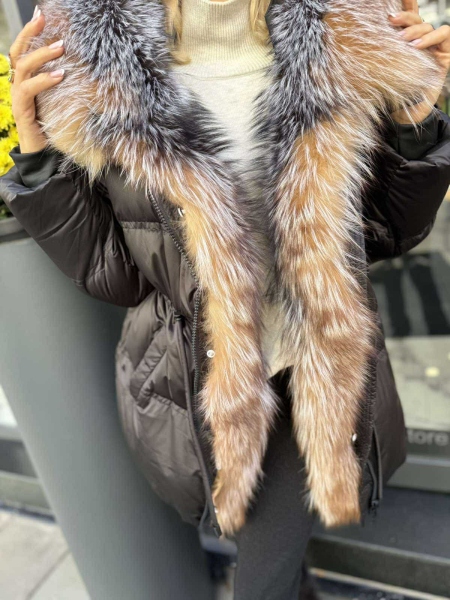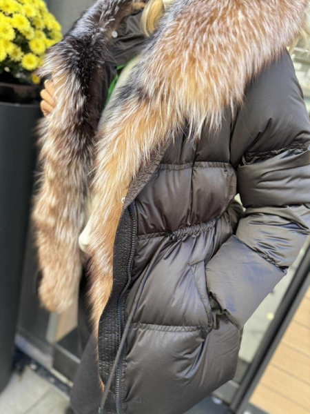 Парка от шушлякова материя в черен цвят с яка от естествен косъм, която може да се сваля. Моделът е с качулка, връзки и стопери на талията за вталяване и копчета за закопчаване. Универсален размер подходящ за M, L.