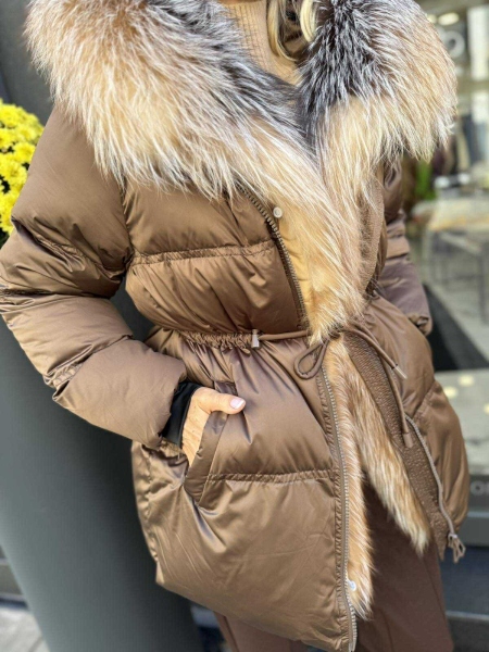 Парка от шушлякова материя в кафяв цвят с яка от естествен косъм, която може да се сваля. Моделът е с качулка, връзки и стопери на талията за вталяване и копчета за закопчаване. Универсален размер подходящ за L, XL.