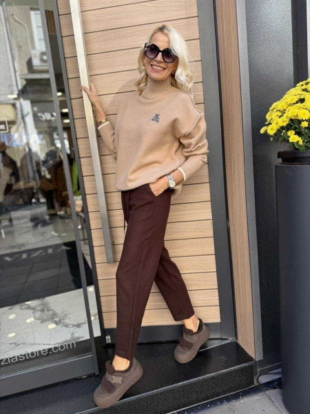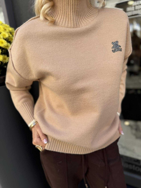 Плътен пуловер от фино плетиво в тъмно бежов цвят. Моделът е със свободна кройка. Универсален размер подходящ S, M, L.