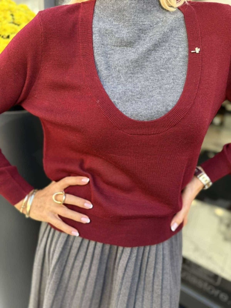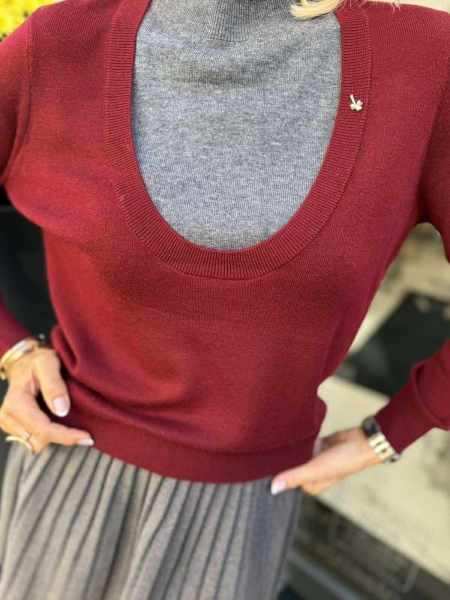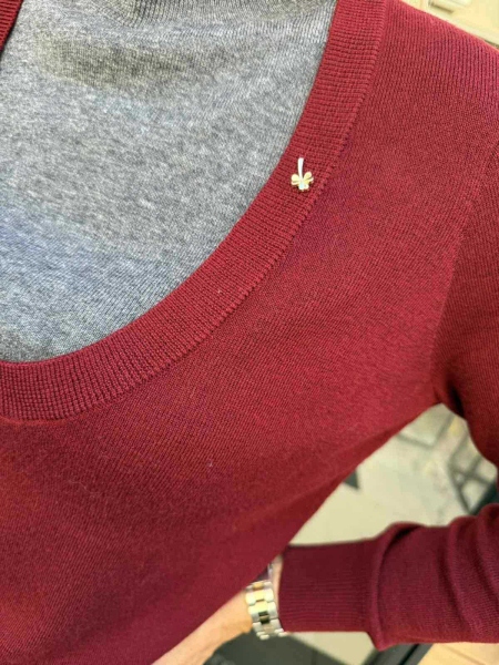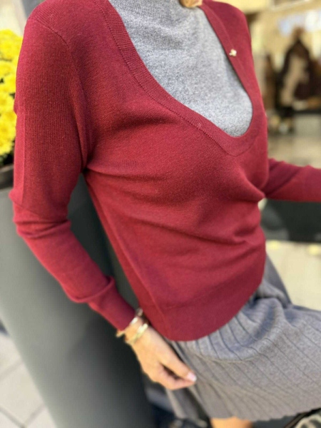 Фин пуловер в сиво и бордо с обло деколте. Моделът е универсален размер подходящ за S, M.