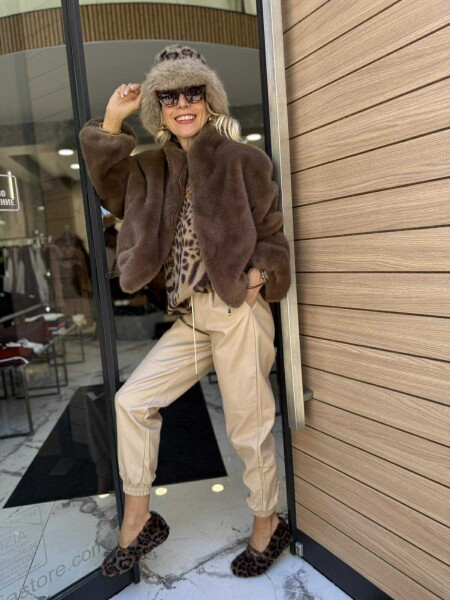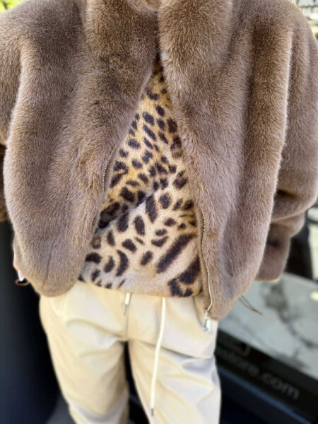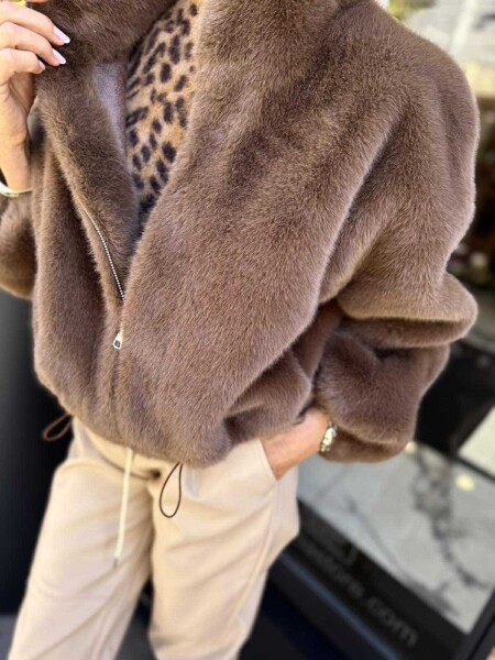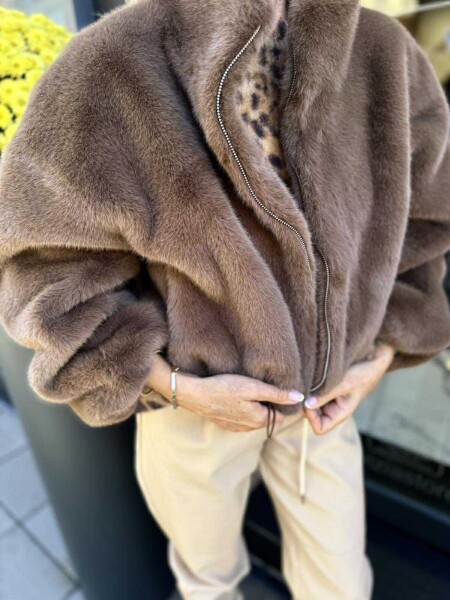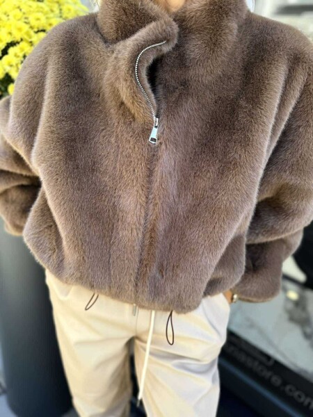 Късо палто от еко косъм в кафяв цвят. Моделът е тип бомбър с висока яка, метален цип и ластици със стопери в долната част. Универсален размер подходящ за S/M.