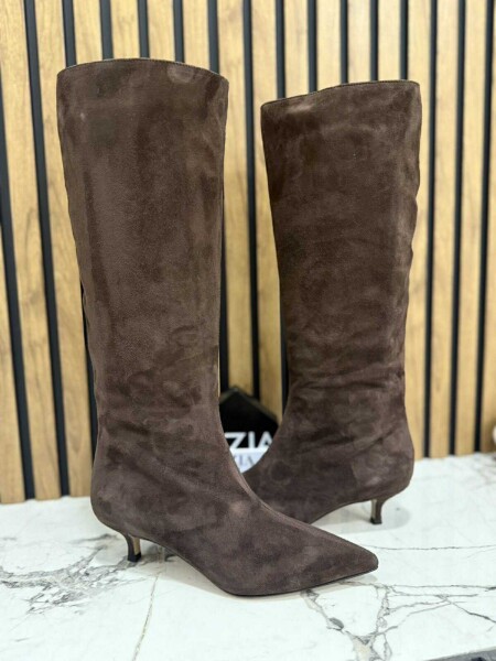 Ботуши от естестяен велур в тъмно кафяв цвят. Моделът е с ниско тънко токче, заострена предна част и страничен цип.