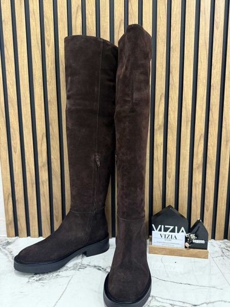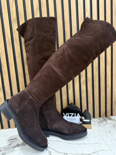 Равни ботуши от естествен велур в тъмно кафяв цвят. Моделът е с дебела подметка, заоблена предна част и страничен цип.