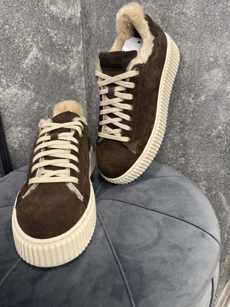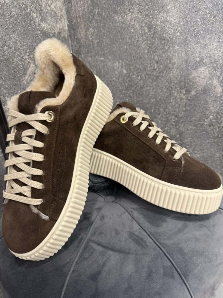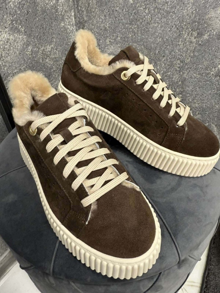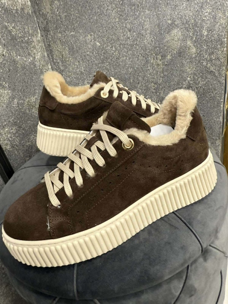 Сникърси от естествен велур в кафяв цвят с висока подметка. Моделът е декориран с топла подплата отвътре.