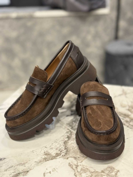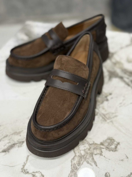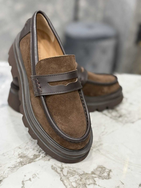 Лоуфъри от естествена кожа в кафяв цвят с дебела и равна подметка. Моделът е заоблен в предната част.