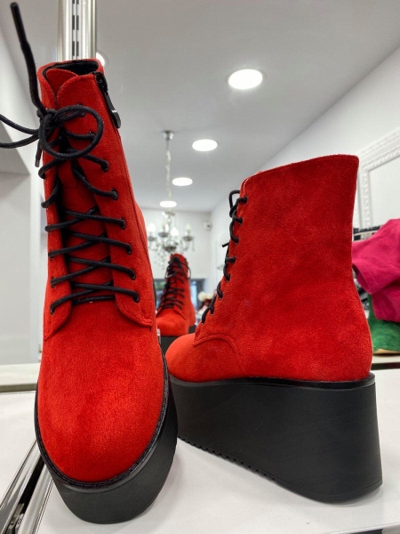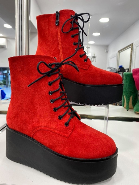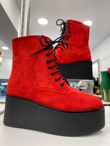 Боти в червен цвят на дебела подметка.Модела е с връзки и има страничен цип.