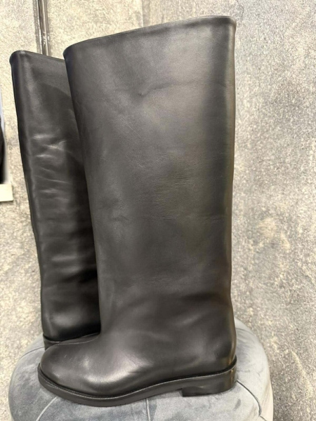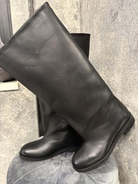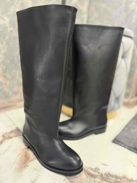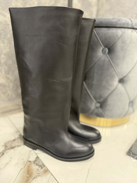 Високи ботуши от естествена кожа в черен цвят. Моделът е с заоблена предна част и се обуват без закопчаване.