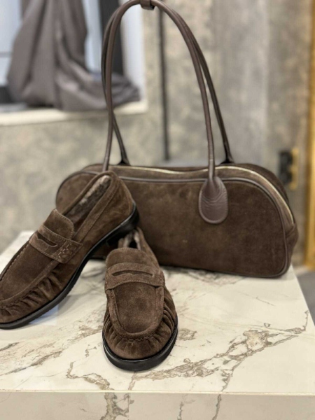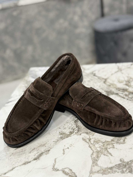 Мокасини от естесвен велур в кафяв цвят с ниска подметка и топла подплата отвътре.