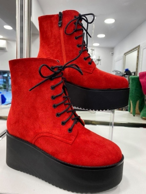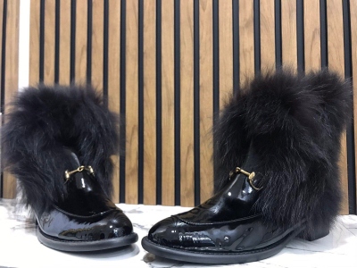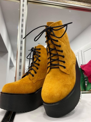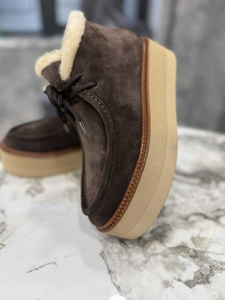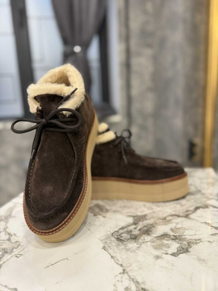 Боти от естествен велур в кафяв цвят с висока подметка и декорация от топла подплата.