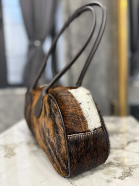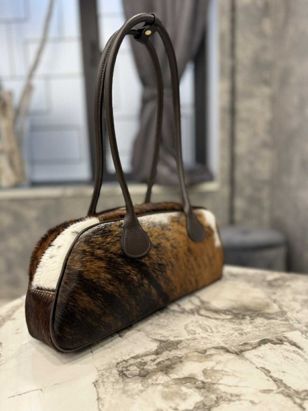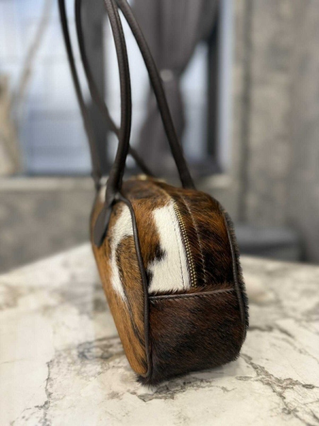 Малка чанта от естествена кожа с две къси дръжки, закопчване с метален цип и едно отделение.