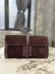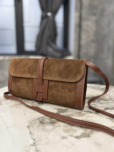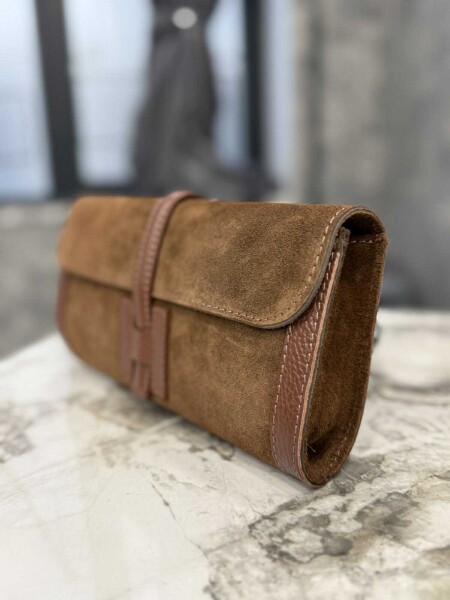 Малка чанта клъч от естествен велур в светло кафяв цвят. Моделът е с магнитно закопчаване и има една преграда.