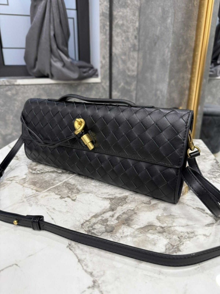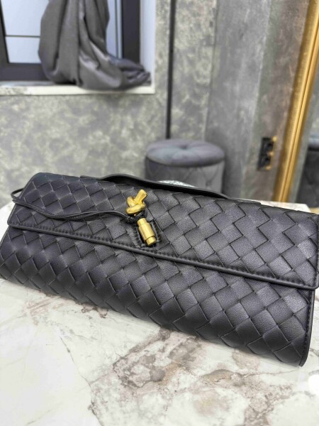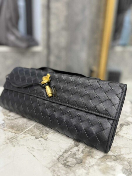 Малка чанта тип клъч от естествена кожа в черен цвят с една малка дръжка и дълга с възможност за сваляне. Моделът е с едно отделение.