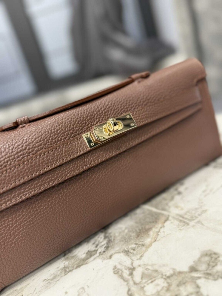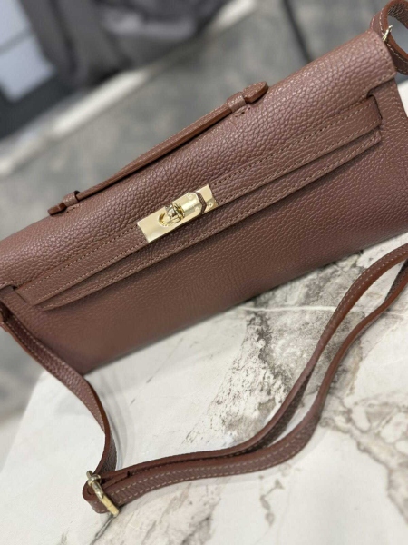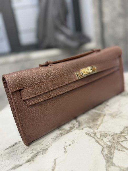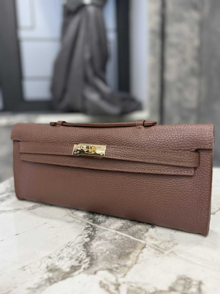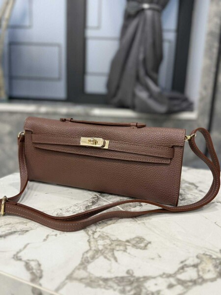 Чанта тип клъч от естествена кожа в кафяв цвят. Моделът е с къса дръжка и една дълга, която може да се сваля.