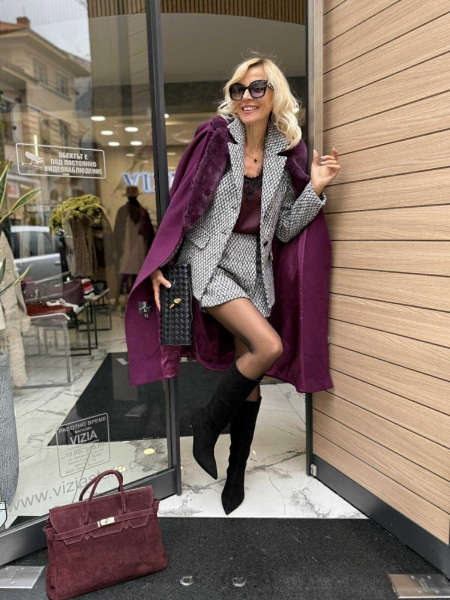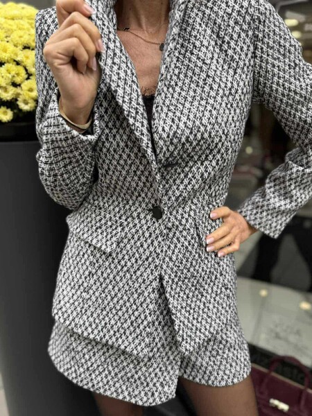 Комплект сако и пола- панталон от плътна материя. Сакото е вталено с ревери се се закопчава с копче. Късите панталони са с висока талия и се закопчават с цип.