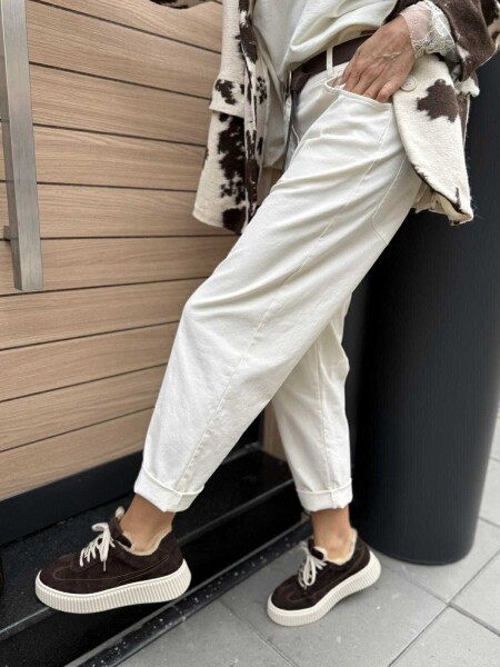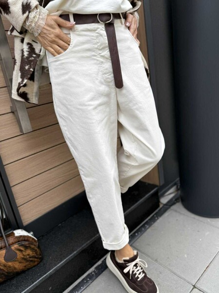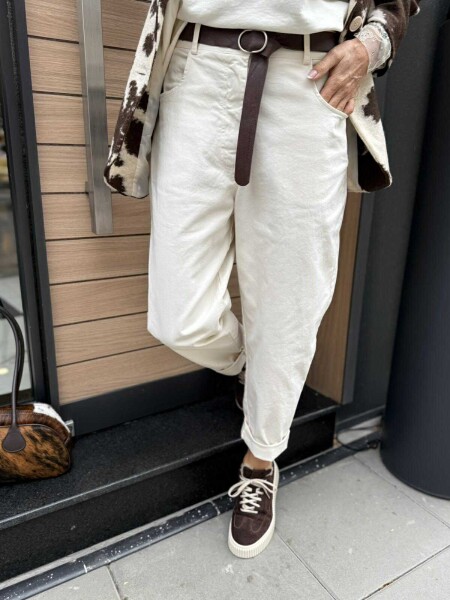 Панталон в цвят екрю със свободни крачоли, ластик на талията и закопчаване с цип и копче. Към него има и колан в кафяв цвят.