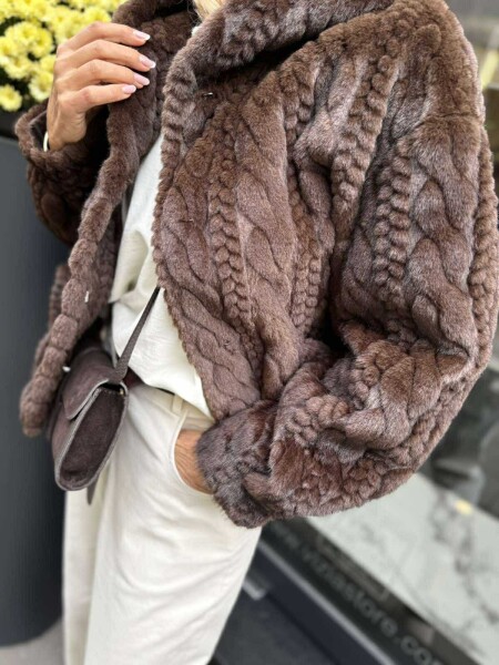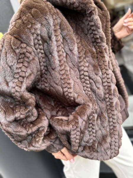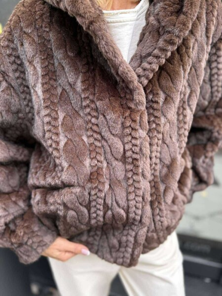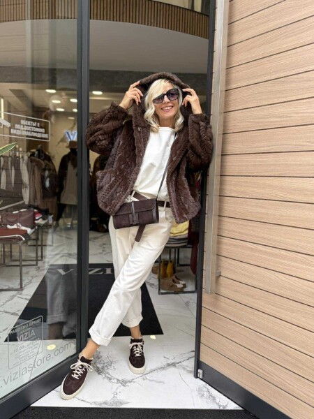 Късо палто в тъмно кафяв цвят от еко косъм. Моделът е с качулка и се закопчава с копчета. Универсален размер подходящ за M, L.