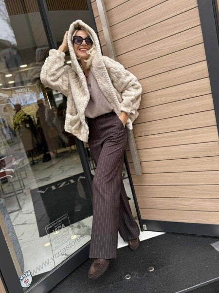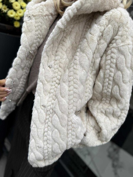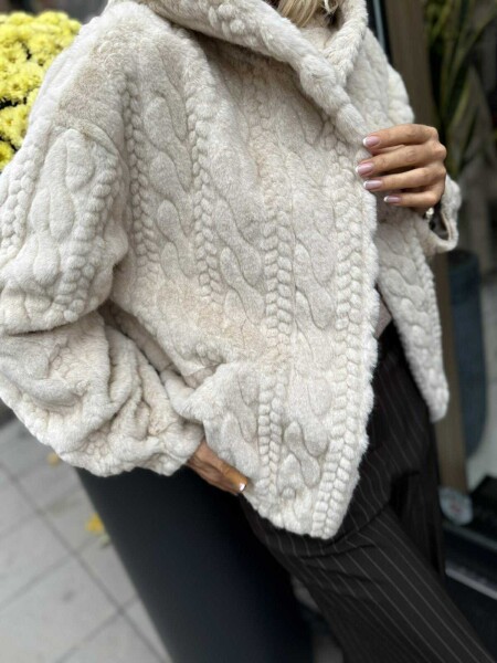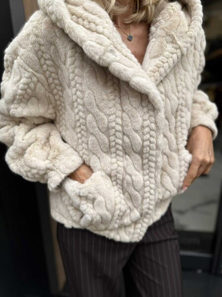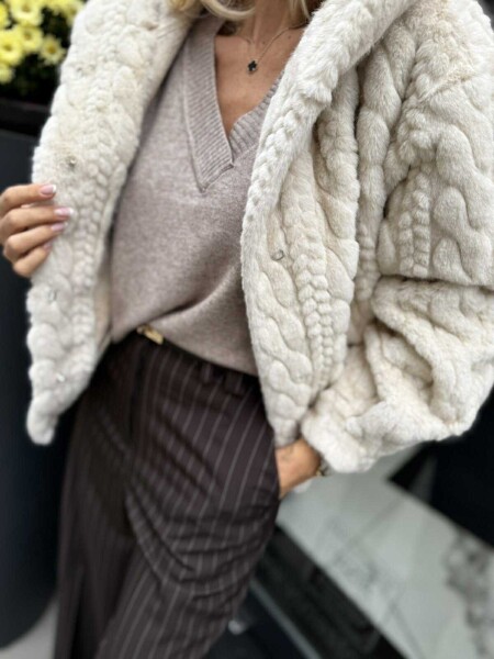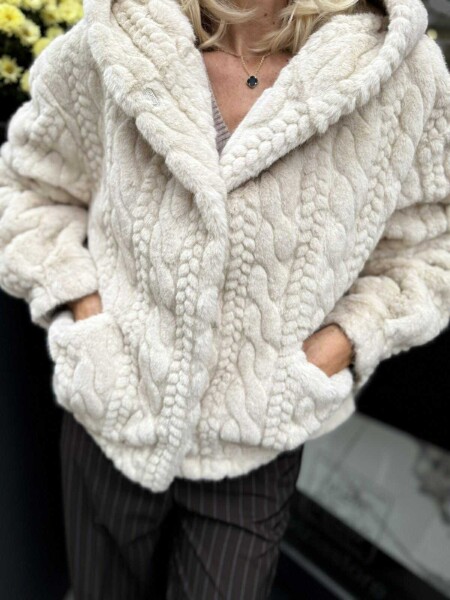 Късо палто в цвят екрю от еко косъм. Моделът е с качулка и се закопчава с копчета. Универсален размер подходящ за M, L.