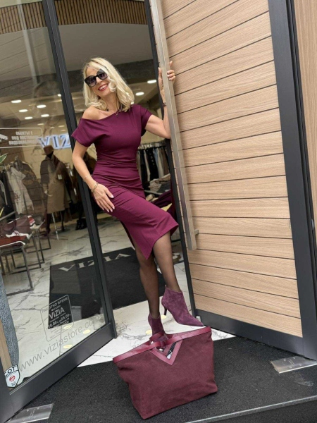 Рокля с миди дължина в цвят бордо с втален силует, набор на талията и закопчаване с цип.
